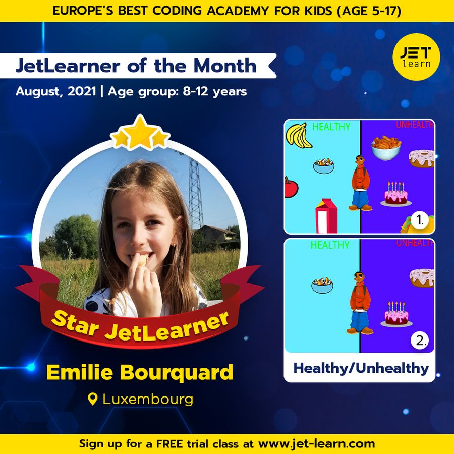 8-year-old Emilie is helping us stay healthy! At JetLearn, she is coding games that are both exciting and meaningful. JetLearn is elated to announce that Emilie has been selected as the JetLearner of the Month for August.