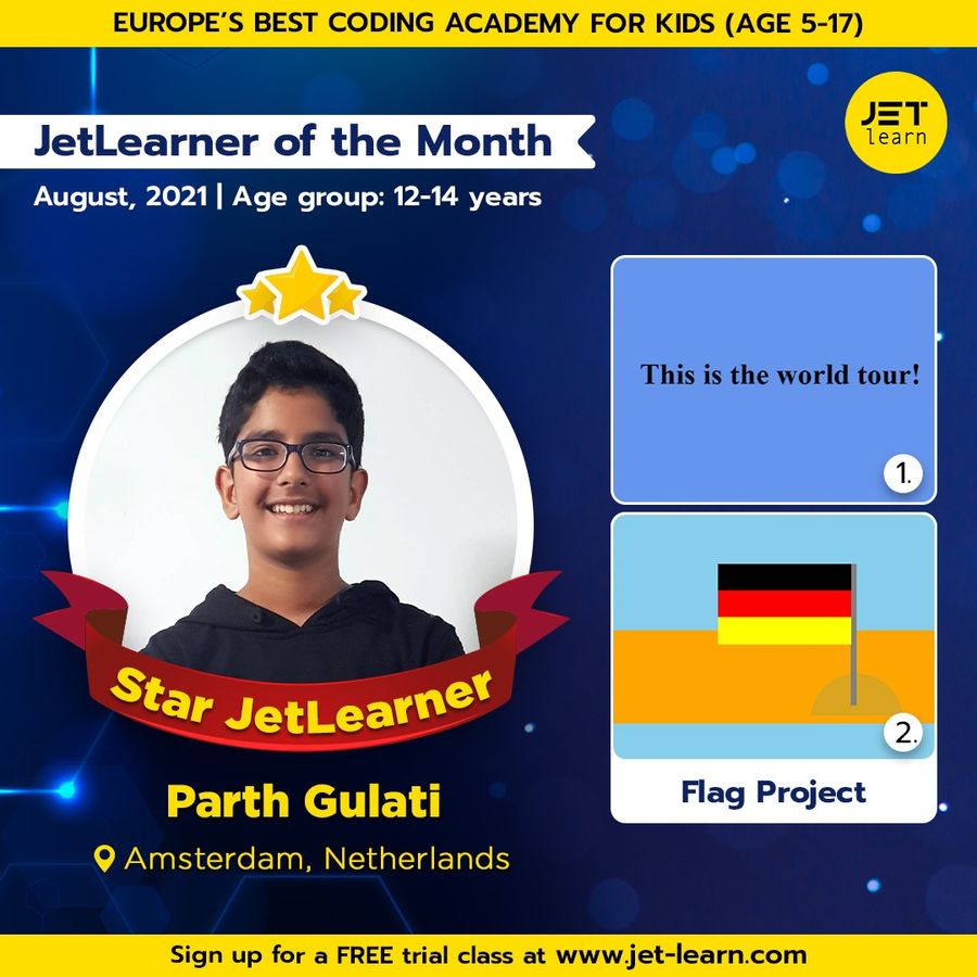 Parth as the JetLearner of the Month for August in the age group of 12-14 years.