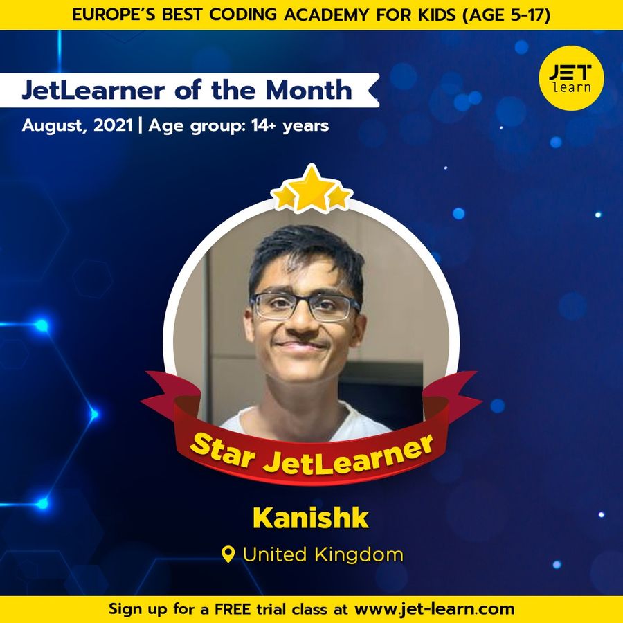 15-year-old Kanishk is blowing our minds with his exemplary coding skills. His project was chosen to be the best amongst 100s of projects in his age group. We are excited to announce Kanishk as the JetLearner of the Month for August in the age group of 14+ years.