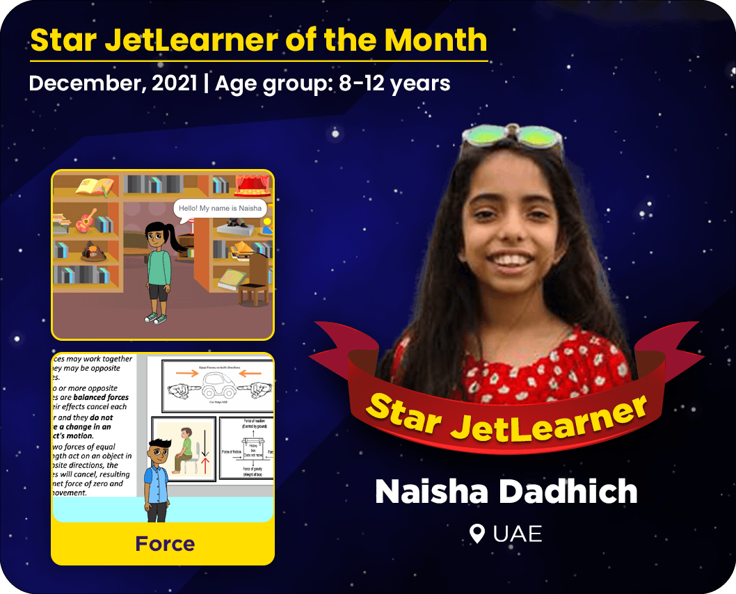 Naisha is an eleven year old JetLearner from the UAE. She is a shining star who puts in efforts with her curious nature. She has built the 'Force' project using the scratch platform that applies Newtonian science.