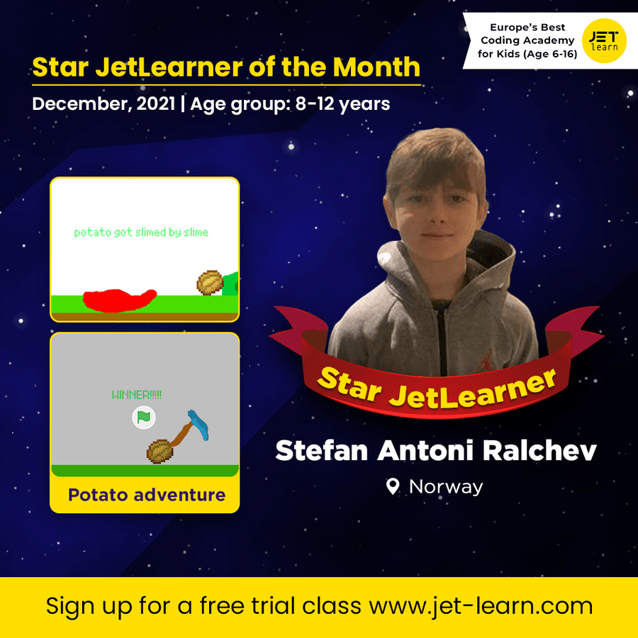 Steffy is a nine year old JetLearner living in the Norway. He is an extremely bright learner and is super comfortable with machines at a very young age. Stefan has built the Potato Adventure game using the Scratch platform.