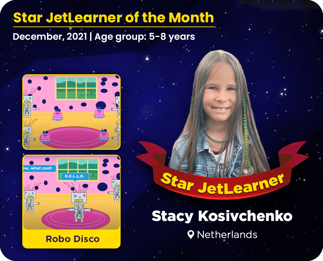She has made a Robo Disco game with her innovative ideas. We are happy to announce Stacy as the Star JetLearner for the Month for December in the age group of 5-8 years.