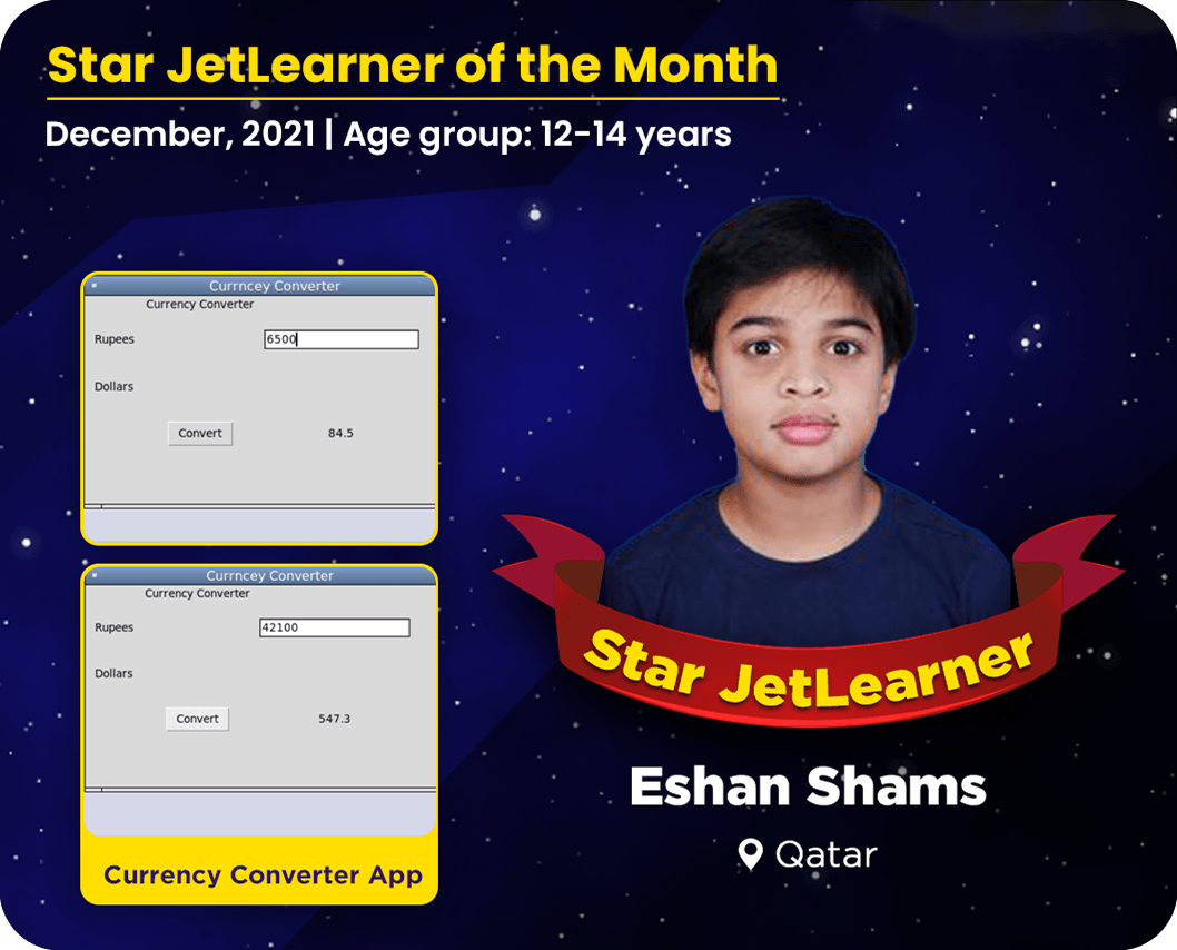 Eshan is a thirteen year old JetLearner from Qatar. He is a quick and confident learner who puts efforts in implementing various programming constructs creatively.