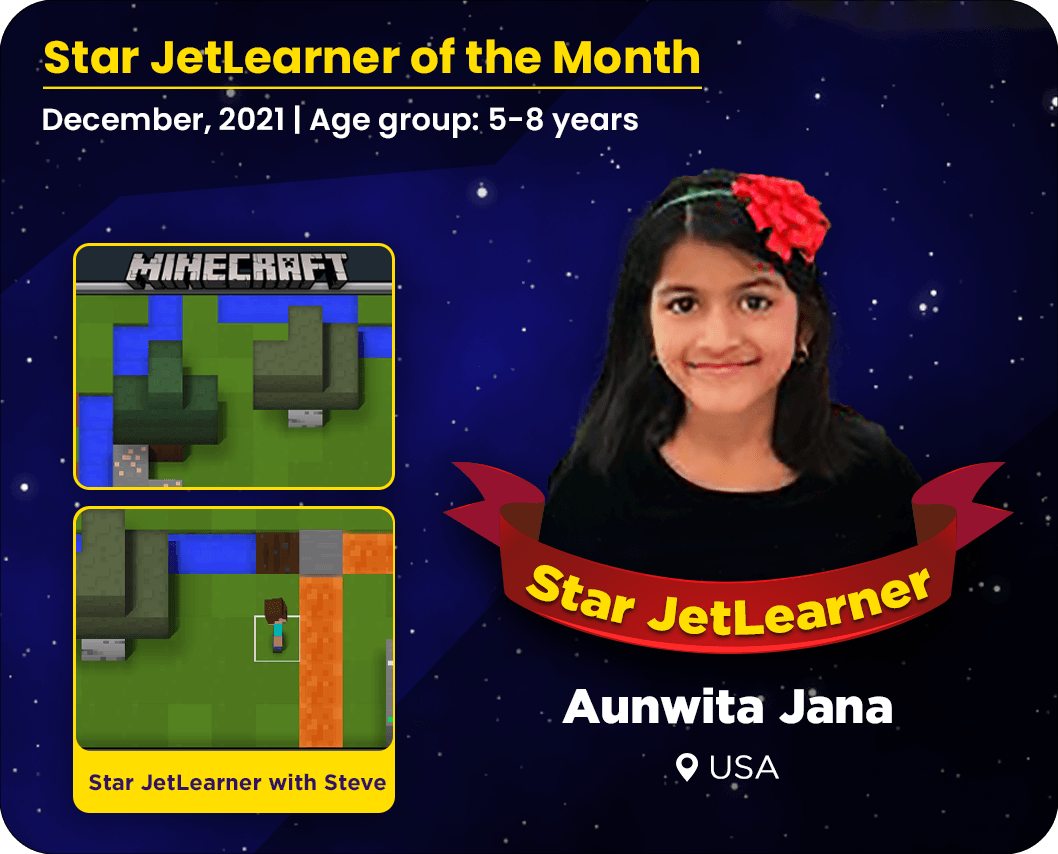 Aunwita is a seven year old JetLearner from the USA. She has built a Minecraft project using the code.org platform with her creativity and inquisitiveness