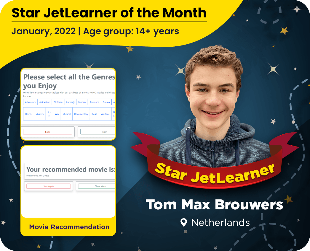Tom is a fourteen year old JetLearner from the Netherlands. He has a splendid passion for learning and understanding new things. His brilliant efforts make him confident in his coding as he progresses consistently each day.
