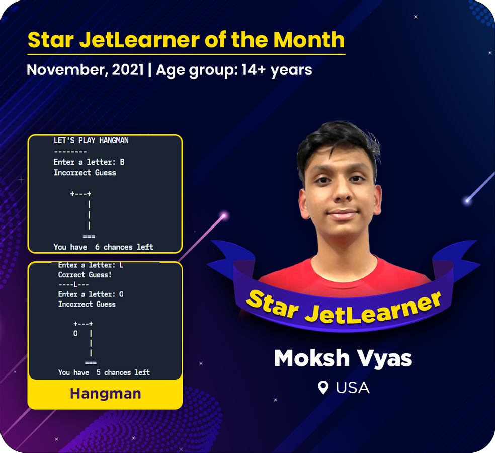 We are happy to announce Moksh as the JetLearner of the Month for November in the age group of 14+ years.