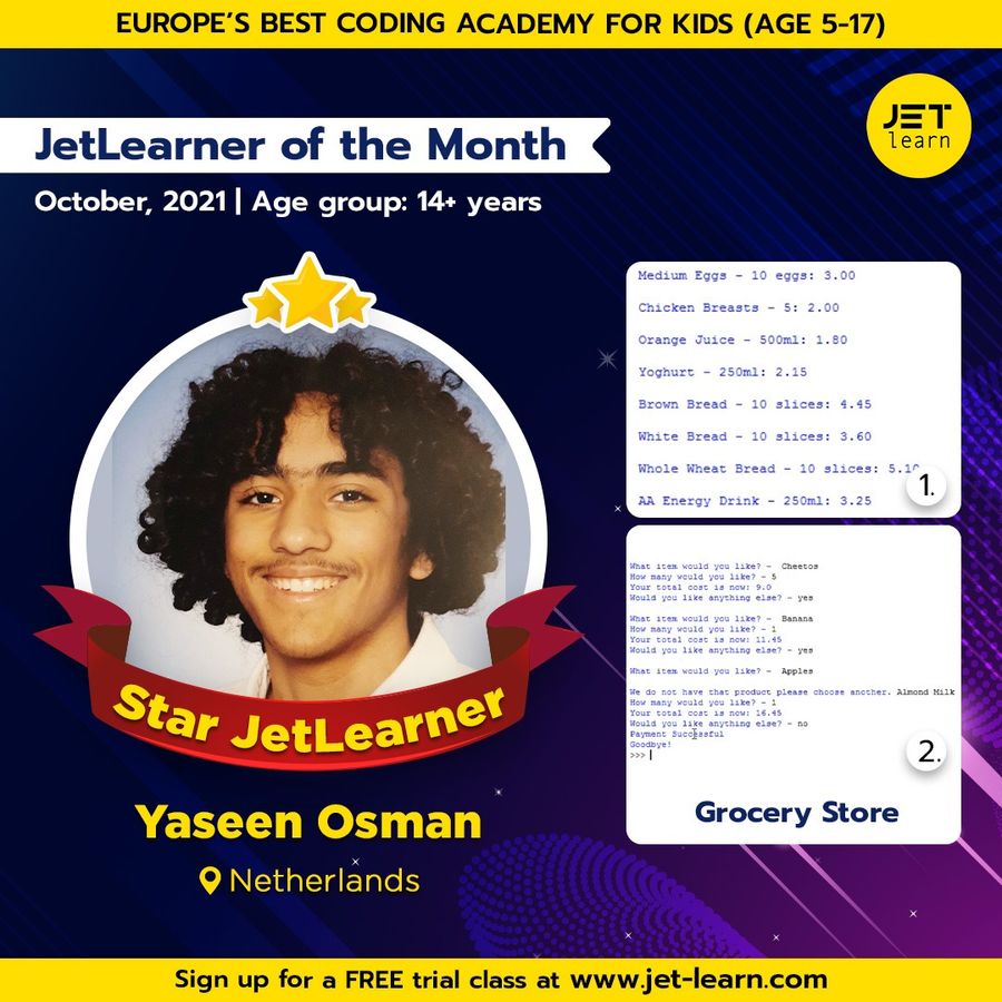14 year old Yaseen is helping you create a grocery store menu using Python. Use his product and your online grocery store is ready. We are proud of Yaseen’s innovation and dedication. We are happy to announce Yaseen as the JetLearner of the Month for October in the age group of 14+ years.