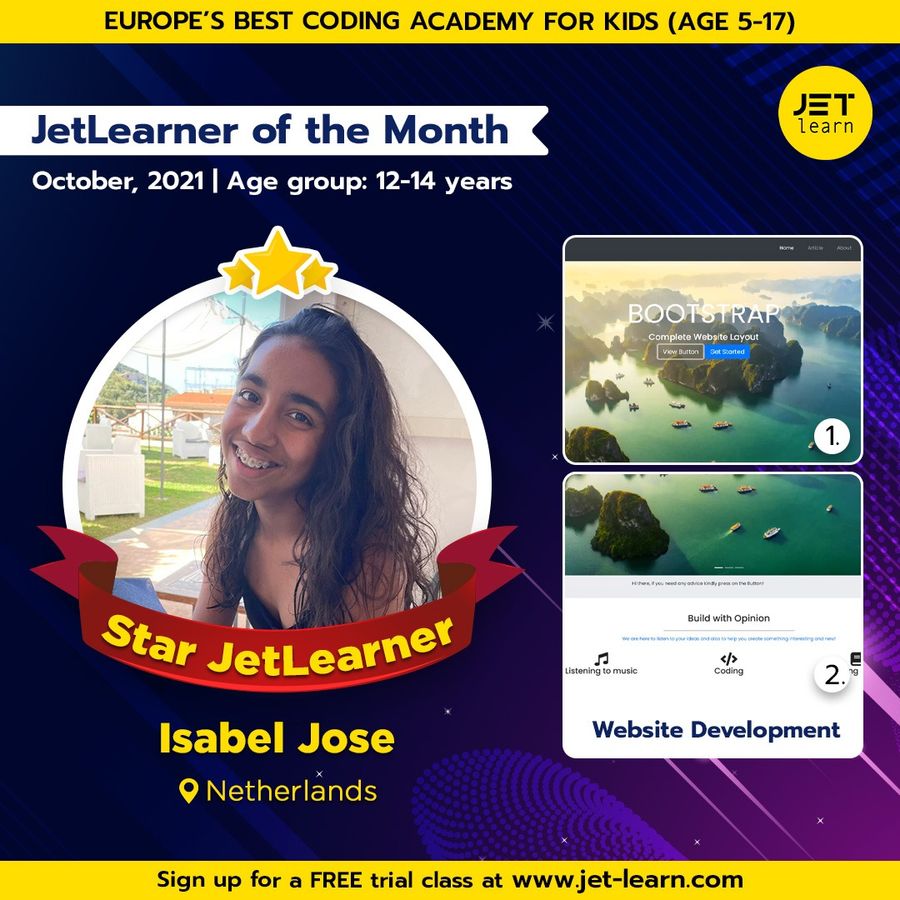 12-year-old Isabel is blowing our minds with her exemplary coding skills. Her project was chosen to be the best amongst 100s of projects in her age group. We are excited to announce Isabel as the JetLearner of the Month for October in the age group of 12-14 years.