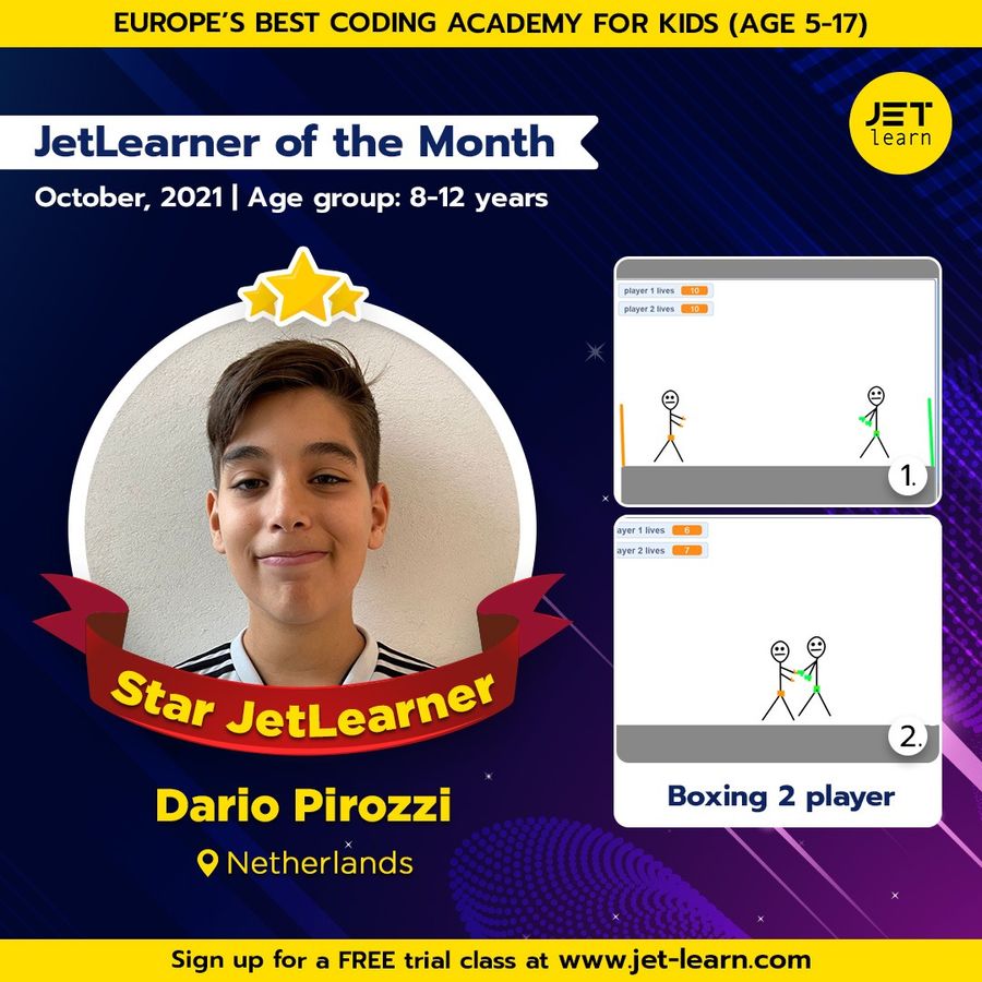 JetLearn Achiever Dario has created an amazing boxing game. You can now experience the thrill of virtual boxing on Scratch, all thanks to Dario. We are happy to announce Dario as the JetLearner of the Month for October in the age group of 8-12 years.