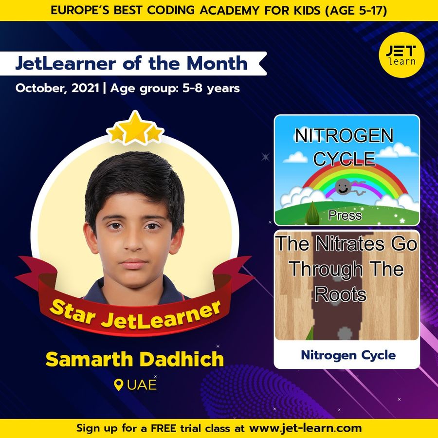 JetLearners are creating waves! 8-year-old Samarth, our young scientist, is teaching us concepts like the Nitrogen cycle. Code.org being the platform, Samarth’s project is not just creative but also informative. We are happy to announce Samarth as the JetLearner of the Month for October in the age group of 5-8 years.