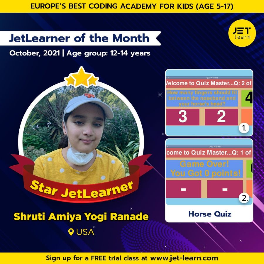 Shruti, a talented coder, and a horse riding enthusiast has created a horse quiz on python. At JetLearn, learners hone their hobbies via coding. We are proud of Shruti’s persistence and creativity. We are happy to announce Shruti as the JetLearner of the Month for October in the age group of 12-14 years.