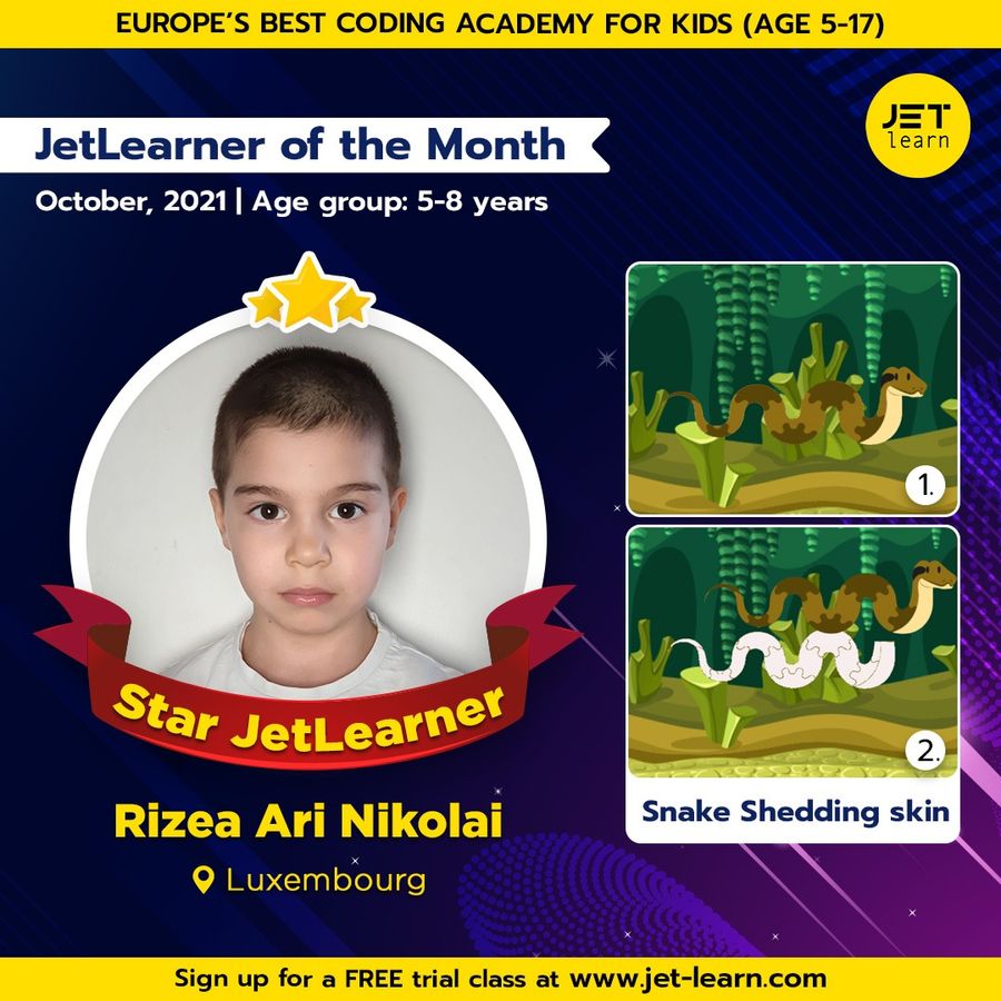 Young Ari is creating extraordinary projects. His project is all about the snake shedding skin concept. Young creators like Ari are truly inspirational. We are happy to announce Ari as the JetLearner of the Month for October in the age group of 5-8 years.